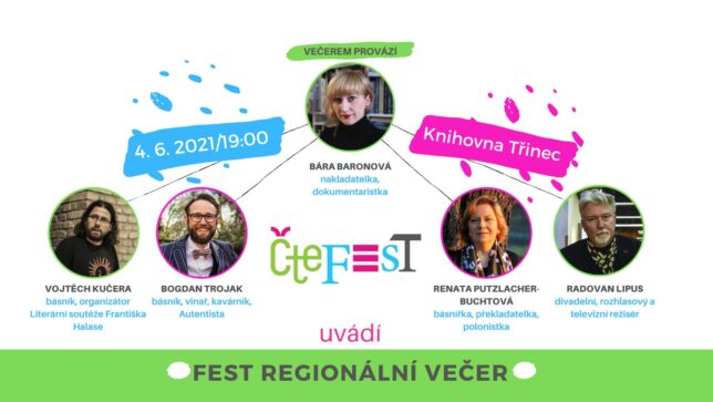 První Čtenářský Festival Třinec bude především o osobnostech. Třinecký region jich má několik a návštěvníci se tak mohou těšit na Renatu Putzlacher-Buchtovou (básnířka, překladatelka, polonistka), Bogdana Trojaka (básník, vinař a kavárník), Vojtěcha Kučeru (básník a organizátor Literární soutěže Františka Halase), Radovana Lipuse (divadelní, televizní a rozhlasový režisér, cestovatel). Akci bude moderovat Bára Baronová (nakladatelka, dokumentaristka).